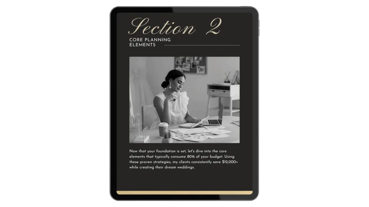 Get our proven 27-step system that's helped hundreds of couples create stunning weddings while keeping thousands in their pocket.